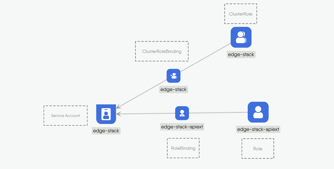 The diagram above shows one of the role assignments and service account relationships within the Ambassador Edge Stack (AES) system. You can see that the Service Account (edge-stack) is linked to both the ClusterRole (edge-stack) and the Role (edge-stack-apiext) through ClusterRoleBinding and RoleBinding.