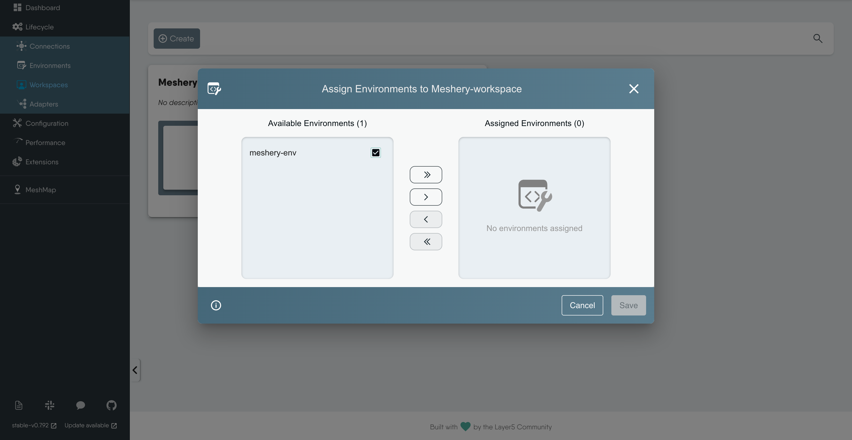 Examples of connections managed by Meshery include GitHub integrations, Prometheus connections, Kubernetes clusters, and more. It’s essential to assign these connections to an environment and link that environment to your selected workspace.